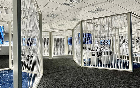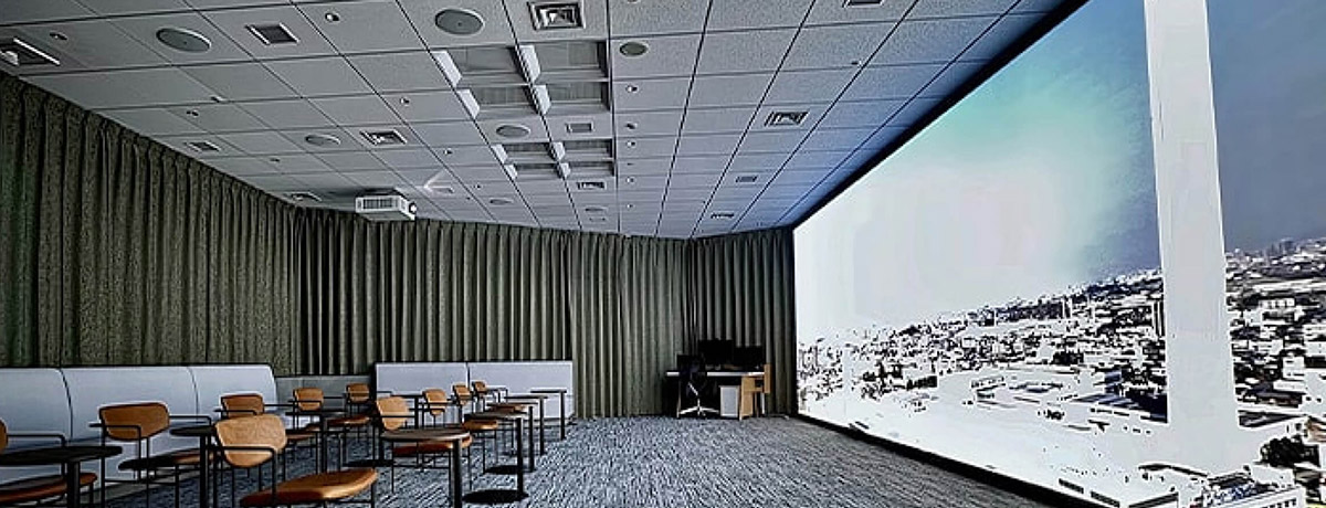 A powerful large screen is installed in the presentation room equipped with “misola” blue sky lighting. Visitors can view content that visualizes images of the future society that our building systems will enable. Livestreamed content also introduces aspects of our Information Center and Distribution Center—which support the safety and security of customers’ facilities 24 hours a day, 365 days a year—as well as our personnel training program that supports product development and maintenance.