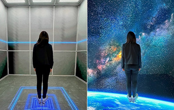 In a room that resembles an elevator, an immersive video presentation shows maintenance work on an elevator and a freezer. The presentation allows you to experience the quality of maintenance work at these rarely seen maintenance sites as if you were actually there.