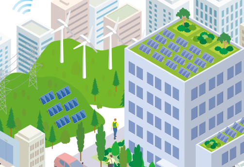 In addition to providing automatic control of facilities that enhance energy efficiency and allow for easy visualization of energy usage, we can help achieve net-zero energy consumption and meet ZEB* standards by adopting various options of energy generation, including the use of solar power. Our solutions also contribute to carbon neutrality in cities by collectively monitoring and controlling multiple buildings.
