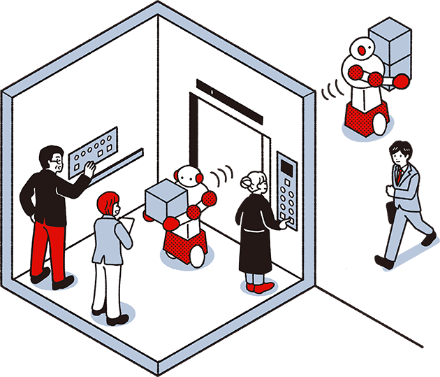 Robots carry out their tasks amongst office workers, freely getting on and off elevators and carrying packages safely and reliably while avoiding people and obstacles. Buildings of the future will be spaces where humans and robots can support each other in comfort.