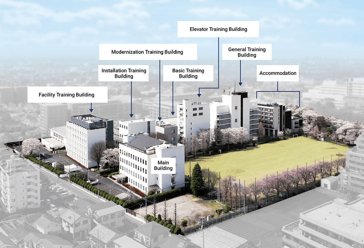 This training center is dedicated to furthering the global expansion of our building systems business by fostering and strengthening the talent responsible for the sales, manufacturing, installation, and maintenance of our elevators/escalators and building management systems. By cultivating leaders for our global bases and providing technical and skills training at each location, we aim to improve the technical capabilities of our affiliates, both in Japan and around the world.