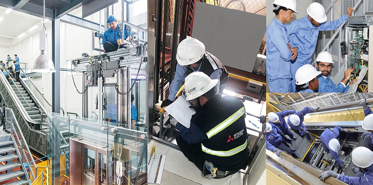 The field service specialists at Mitsubishi Electric’s global affiliates and agencies conduct maintenance on elevators and escalators operating around the world, supporting increased safety and comfort for users. We make best use of our training facilities worldwide to provide our field service specialists with systematic education and training programs adapted to local characteristics and individual requests from affiliates and agencies to help them acquire a superlative level of maintenance and repair skills. Through our global network, we develop multi-skilled maintenance personnel who can service other elevator and escalator brands as well, increasing the ways in which they can help provide a more comfortable life for people all over the world.
