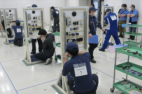 Since 1977, Inazawa Building Systems Works has held this competition for the purpose of passing on skills and maintaining and improving skill levels in young engineers engaged in elevator manufacturing. This is a global competition; participants from across Japan and from affiliated companies and partner companies around the world gather at the Works to compete by demonstrating the skills they have cultivated in their daily work.